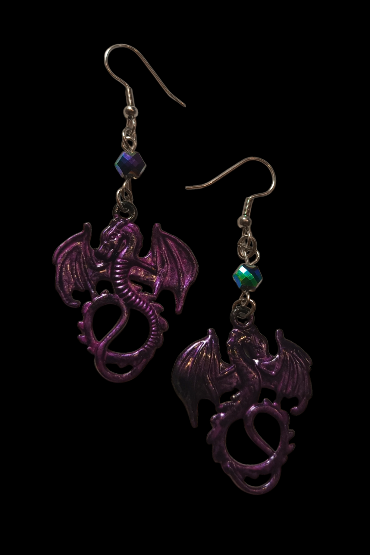 Käsinmaalatut lohikäärmekorvakorut, molemmin puolin metallinhohtoiset violetit. Muovihelmi shiftaa violetista vihreään.