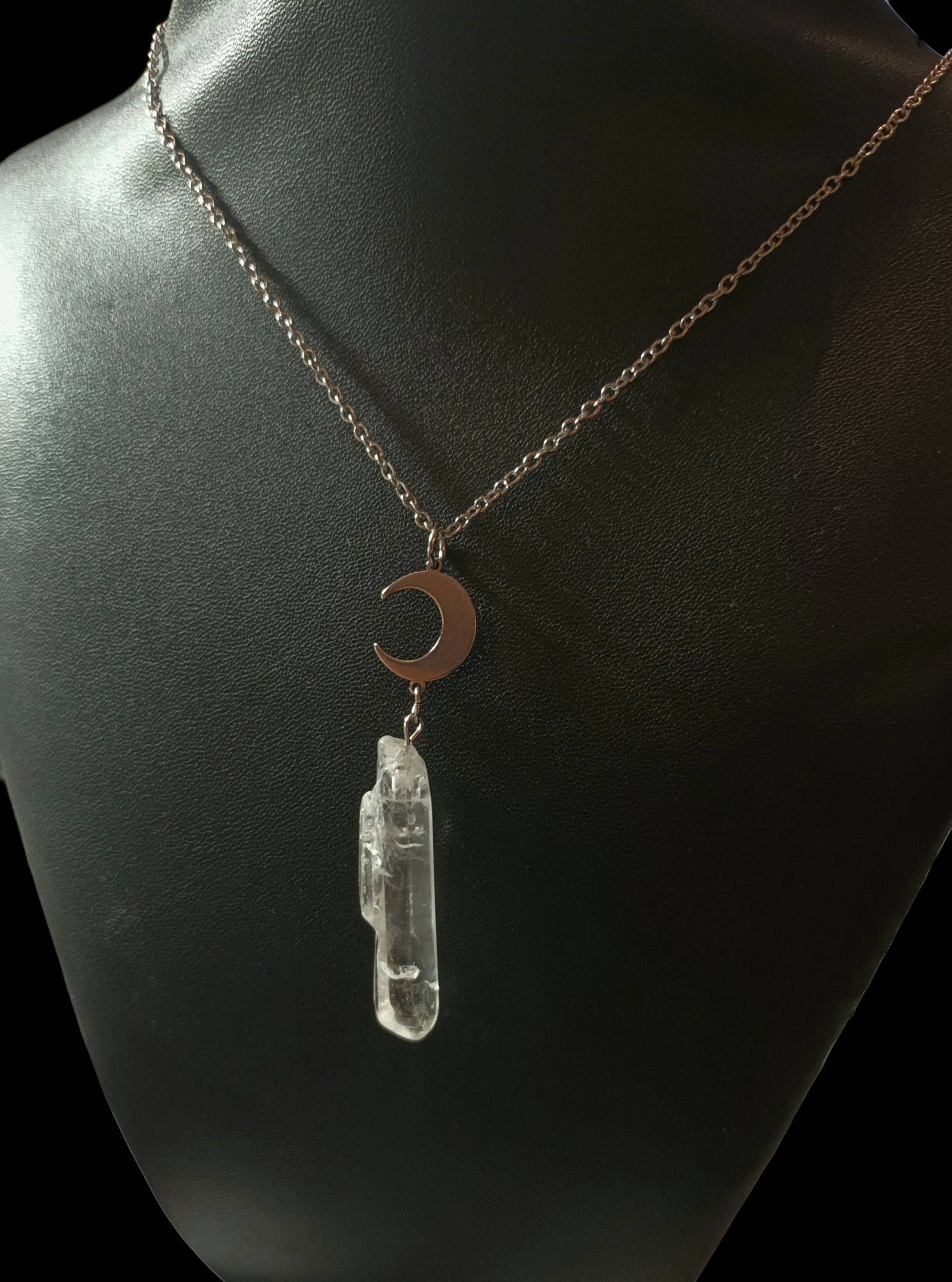 Pieni kuu ja kirkas kvartsi kaulakorussa.