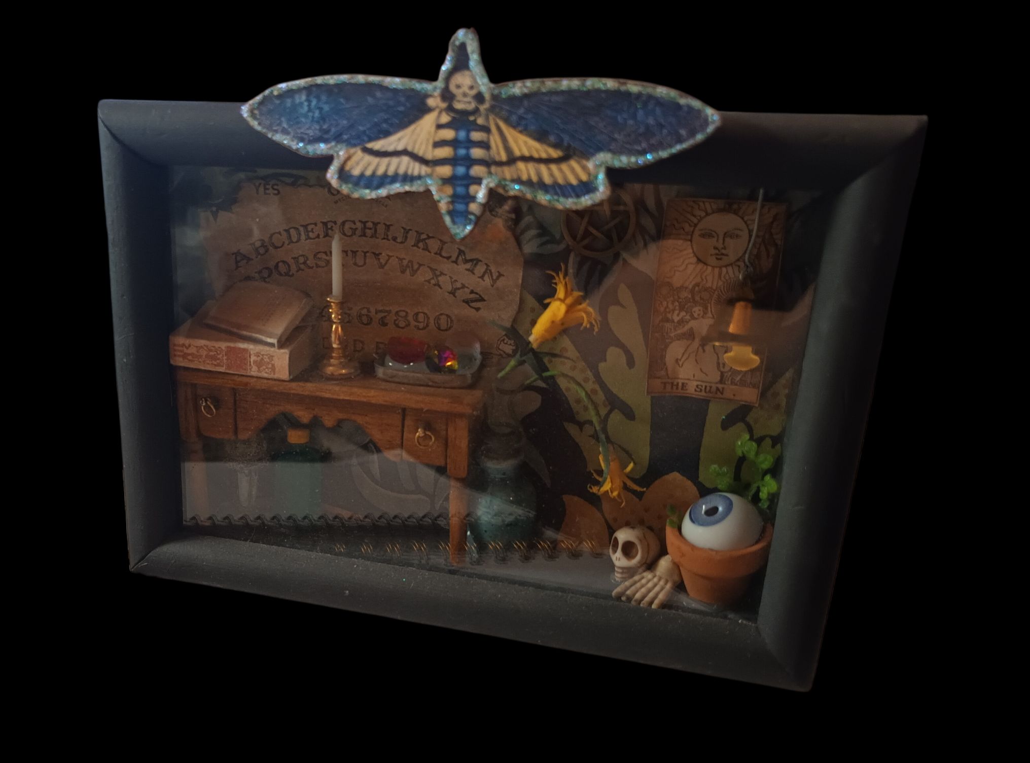 Nukkekodin tarvikkeista ja kierrätystavarasta kasattu miniatyyritaulu. Pysyy pystyssä takana olevan jalan avulla.