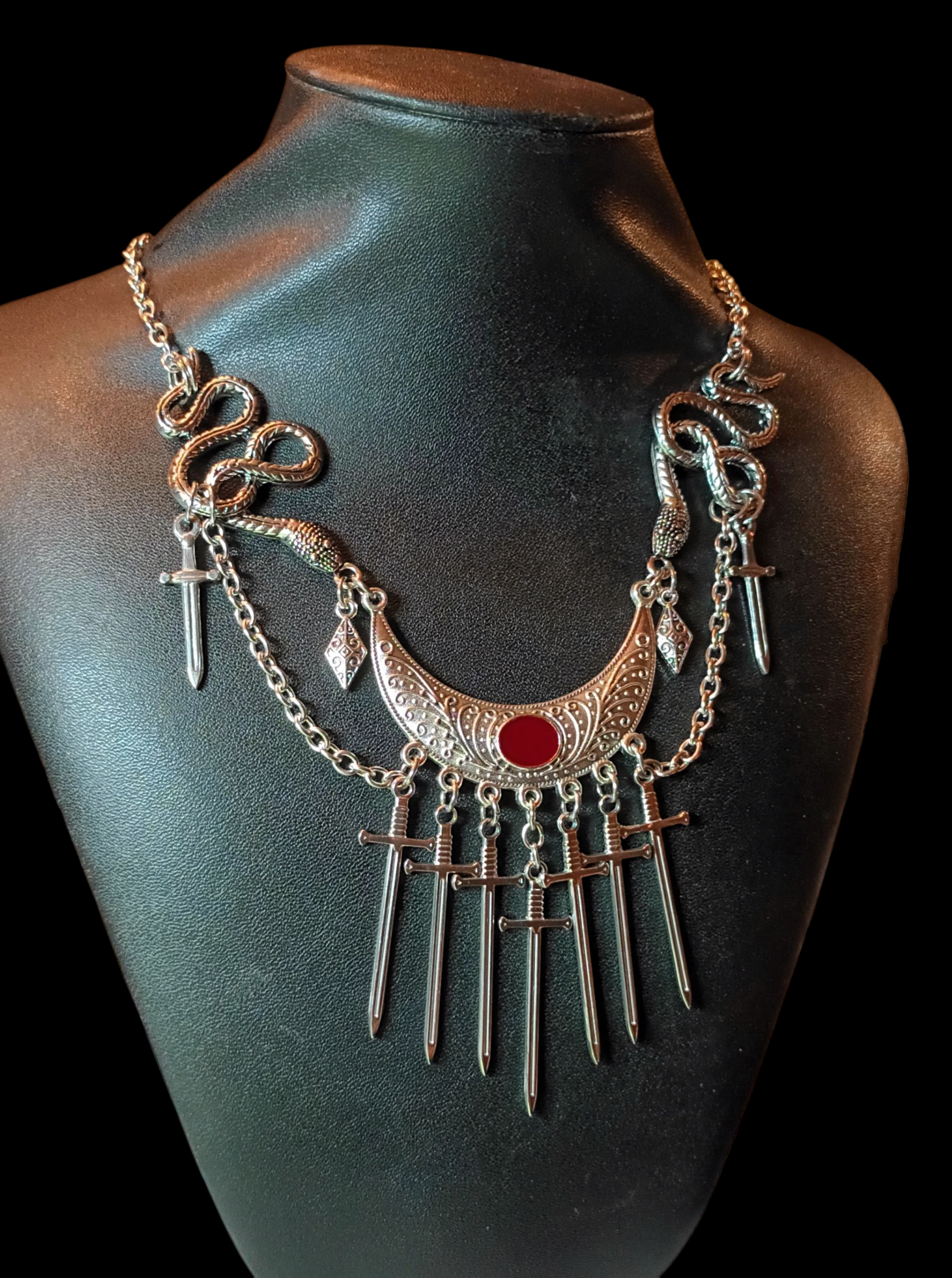 Näyttävä miekoin koristeltu kaulakoru. Toimitetaan mustassa korurasiassa.